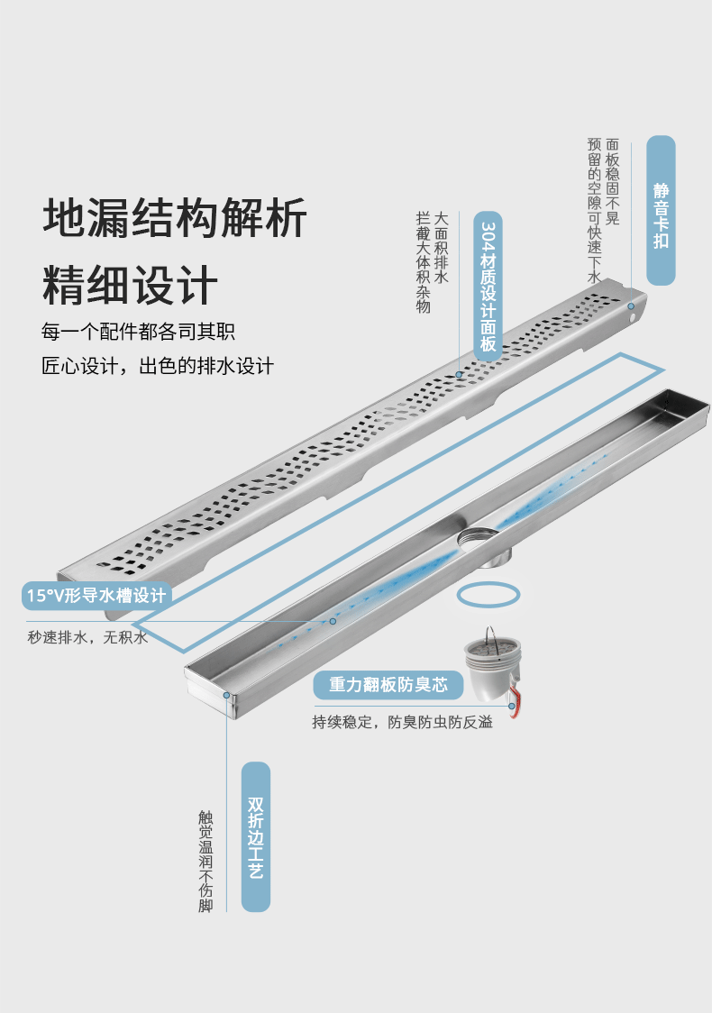 核心工藝:15度V形導(dǎo)水槽設(shè)計,秒速排水,創(chuàng)新設(shè)計帶來強勁實力;