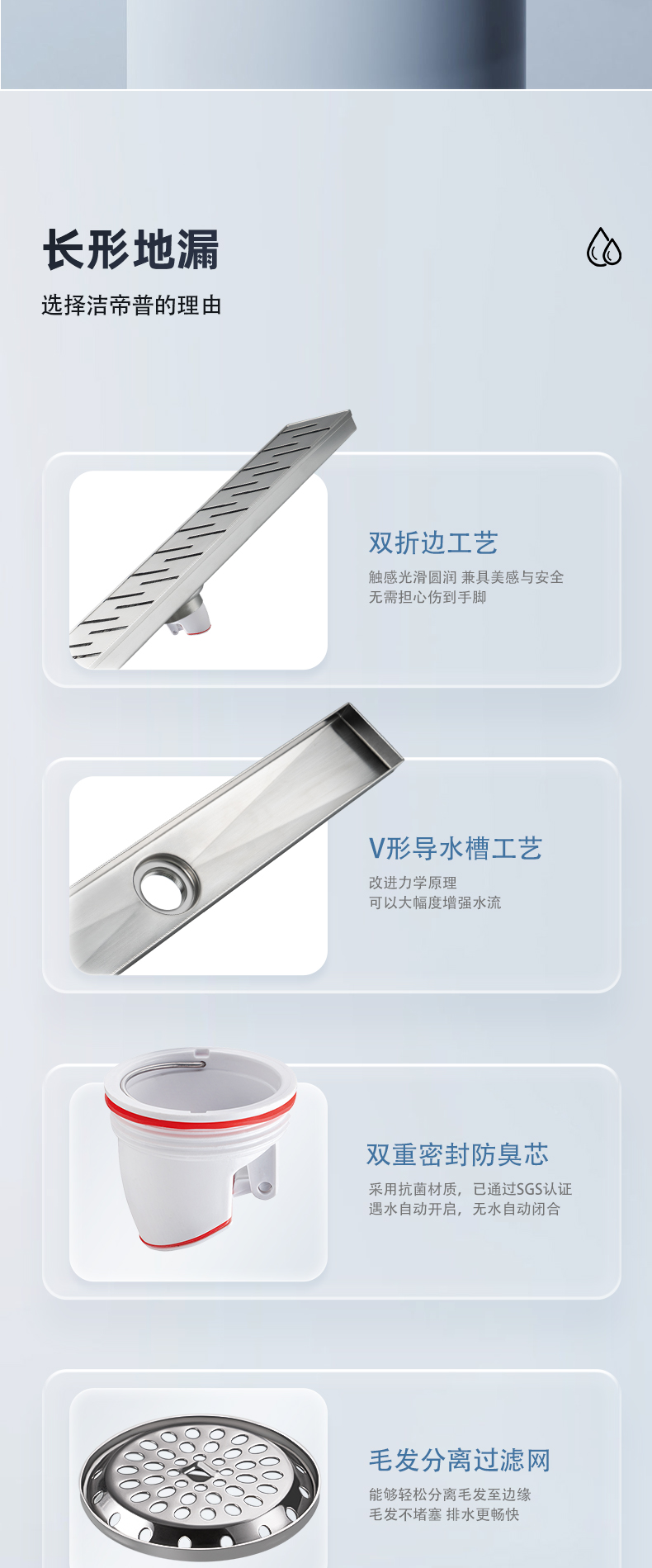 核心工藝:15度V形導(dǎo)水槽設(shè)計,秒速排水,創(chuàng)新設(shè)計帶來強(qiáng)勁實(shí)力;